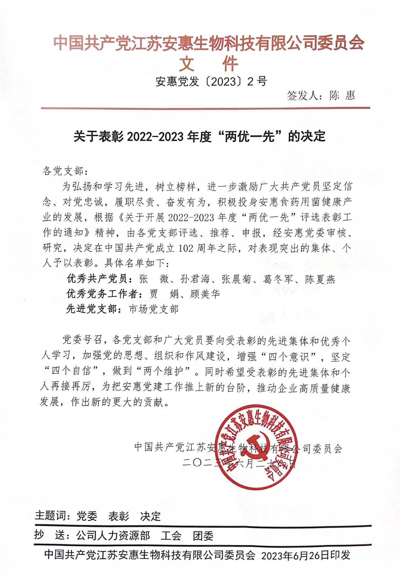 安惠黨委關于表彰2022-2023年度“兩優一先”的決定