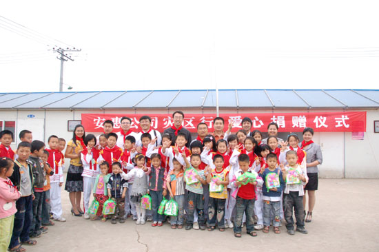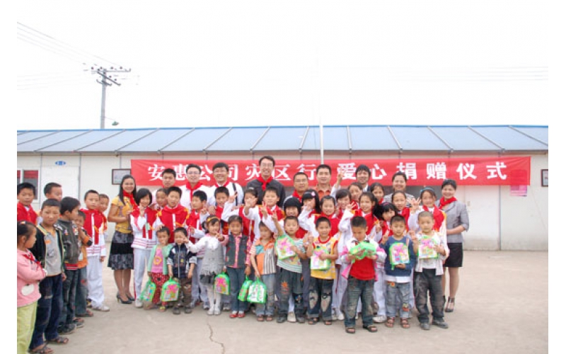 2009年5月12-13日,安惠公司舉行大地震周年系列紀(jì)念活動(dòng)。副總經(jīng)理柯建民再赴德陽,給綿竹拱星小學(xué)孩子們送去“愛心包裹”。