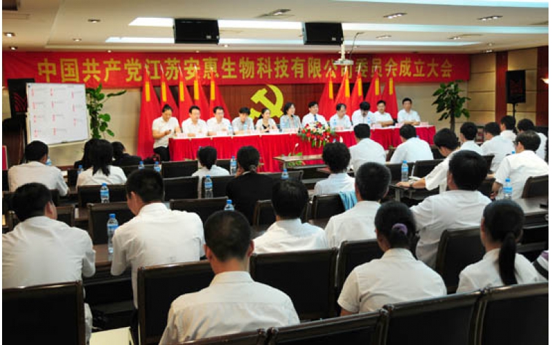2009年6月30日,中國共產(chǎn)黨江蘇安惠生物科技有限公司委員會成立。開發(fā)區(qū)黨工委副書記、管委會副主任嚴(yán)憲,“兩新”工委書記、組織部副部長邵平,紀(jì)工委副書記王艷青等出席成立大會。